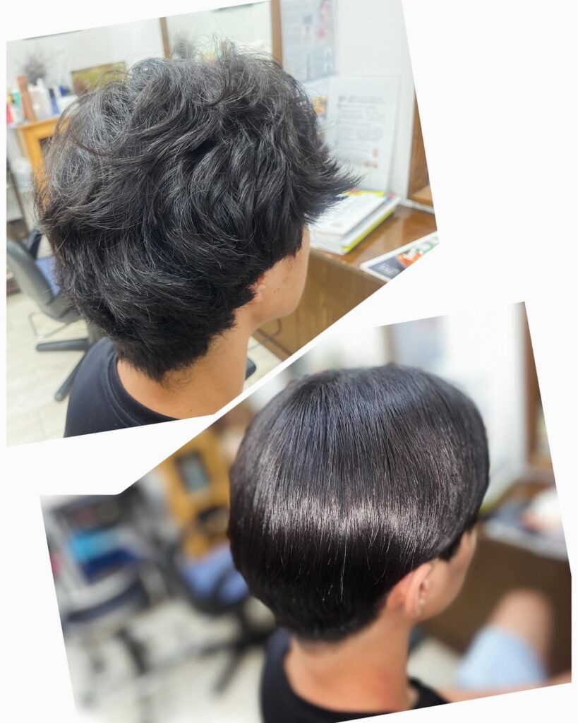 昨年末に縮毛矯正をしたそうです。毛先10cmは特に髪が傷んでいましたが、5cm程カットして内側を減らし込みました。アミノ酸やミネラルを補充して髪が元気になりました!(^^)!