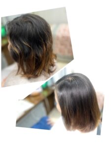 ブリーチの入っている超猫っ毛です。ウネリが強く髪の傷みも懸念されますが、根元に使う薬剤と中間〜毛先の薬剤の強さを変え根元は強めの薬剤でウネリは取り、中間〜毛先の薬剤は優しくしてダメージは軽減しています。今回は部分矯正でつむじ下〜耳の後ろで分けた前の部分を矯正!