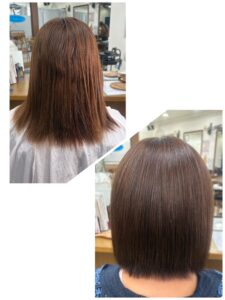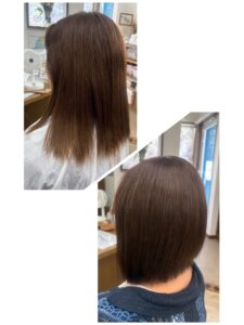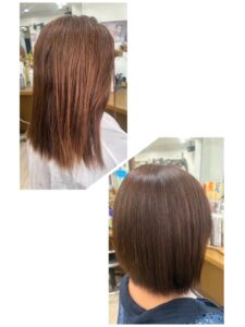 2025/10/11 縮毛矯正の履歴有りで自宅でセルフカラーもされているとの事です!毛先がかなり傷んでいました。ウネリを解消して毛先も随分カットし、感触が良くなりました。7トーンのイエロー系ブラウンで染めました(*^^)v ヘアカタログ