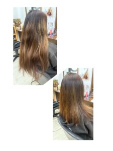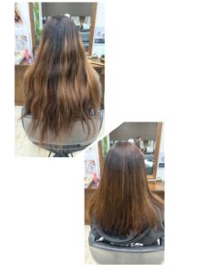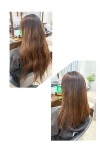 超ロングヘアーで結構傷んでいました。ダメージ部分をカットして癖を緩和させて感触アップ!(^^)!
