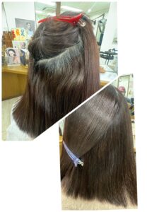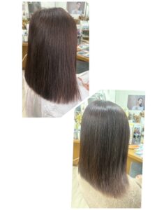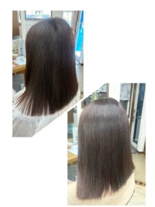 後頭部や耳の後ろの癖が非常に強いです。新生部を明るめに染めました。感触は超サラサラです(‘◇’)ゞ