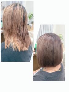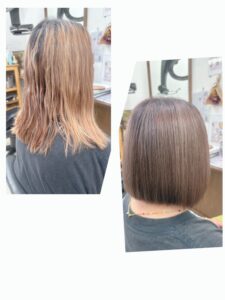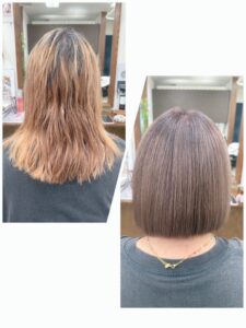 ボブスタイルにカットした後、グレージュベースにピンクとブルーバイオレットで少量捕食しクリアを足してくすんだ感じの淡い色にしました(*^^)v